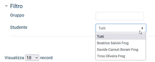 Per migliorare l'analisi e la consultazione si può filtrare il report per gruppi, digitando il nome nell'apposita area di testo, oppure per utente, tramite un menù a tendina.