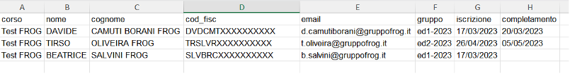 Il report riporta, per ciascun utente, i dati relativi a "Titolo corso", "Nome", "Cognome", "Codice fiscale", "E-mail", "Gruppo (edizione) di appartenenza", "Data di iscrizione al corso" ed eventuale "Data di completamento del corso". Se la data di completamento non è valorizzata significa che l'utente non ha completato il corso.